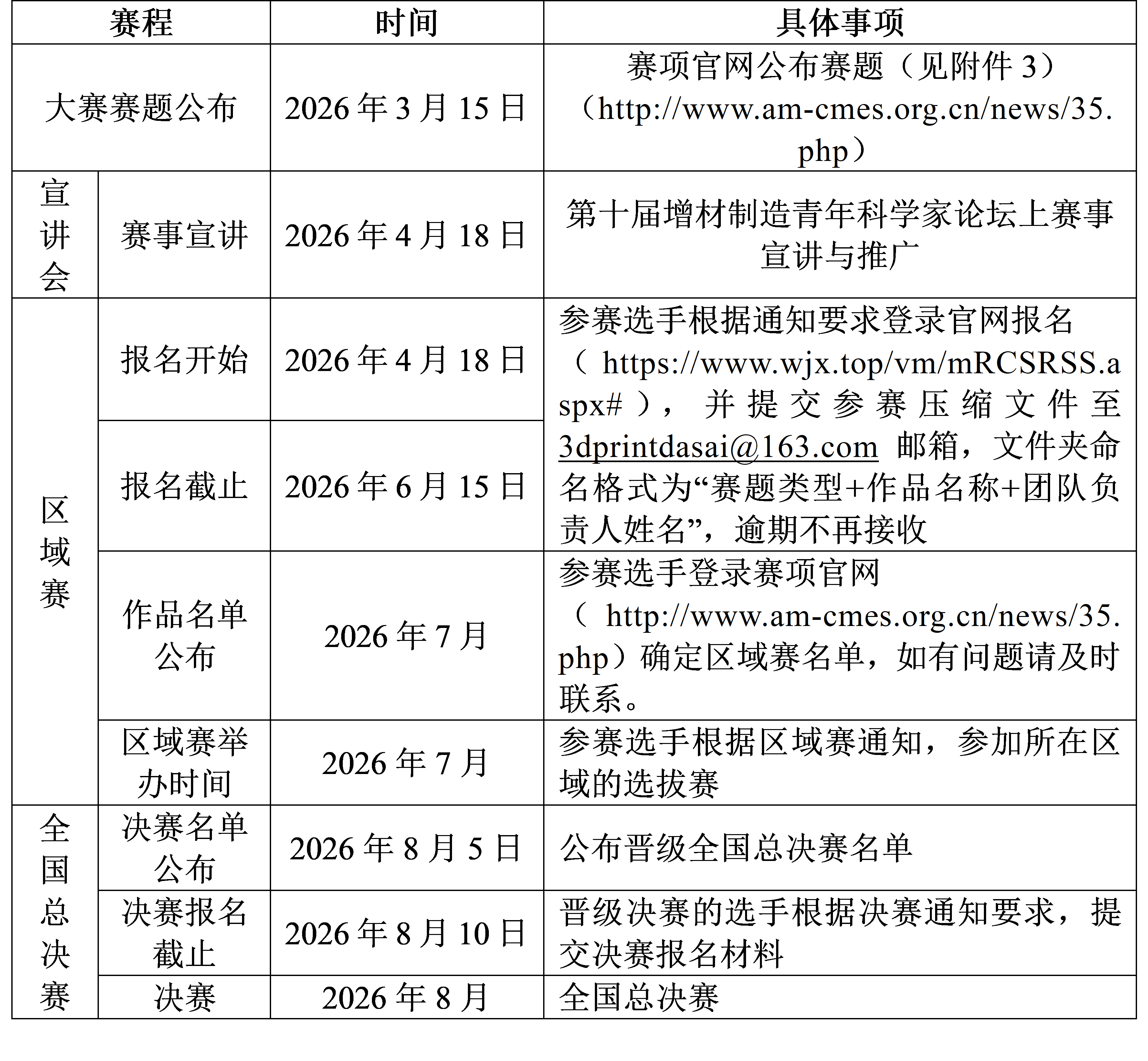 增材制造创新创意大赛是创立于2026年的新赛项。本赛项由中国机械工程学会增材制造技术分会、特种加工分会承办,由清华大学、西安交通大学、西北工业大学、北京航空航天大学、华中科技大学、华南理工大学、南京航空航天大学、北京理工大学等八所高校协办/合办,主题为“产业牵引创新,遴选优秀人才”。大赛旨在构建国内聚焦增材制造技术高端竞技平台,激发大学生(专科生、本科生和研究生)在增材制造领域的创新潜能,将学科竞赛深度融入卓越工程人才培养体系,引导高校师生聚焦大国重器研发中的共性关键技术与工程难题,推动增材制造技术从科研探索向工程应用转化,为实现高水平科技自立自强储备战略性创新力量。