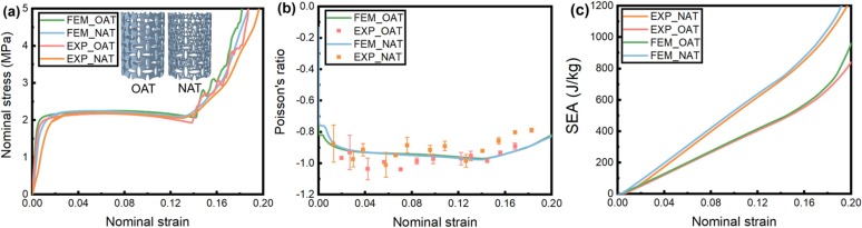 在这项工作中,首先对结构的机械性能进行了分析。由图2可知,NAT 的名义应力-名义应变曲线和泊松比-名义应变曲线与 OAT 基本相同,而 SEA 有很大的改进。这个结果对于工程应用非常有吸引力。