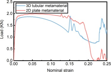 图5 3D管状超材料和2D板超材料之间的机械性能比较