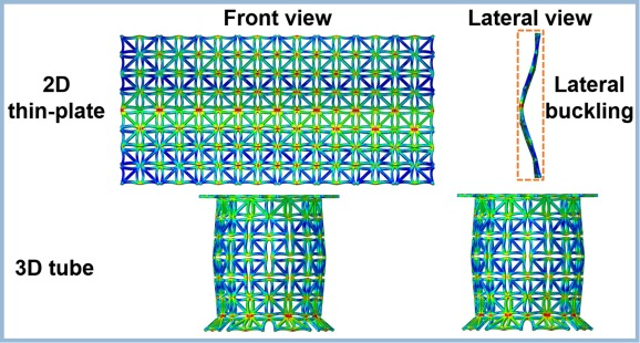 图5和图6给出了3D管状超材料和2D板超材料之间的机械性能比较。可以清楚地发现,2D板超材料在应变为0.2时整体存在横向屈曲不稳定性,载荷下降到接近0,而3D管状超材料由于圆周约束仍然具有良好的稳定性。因此,当薄板结构相对较薄时,使用坐标变换可以大大改善面外不稳定性。