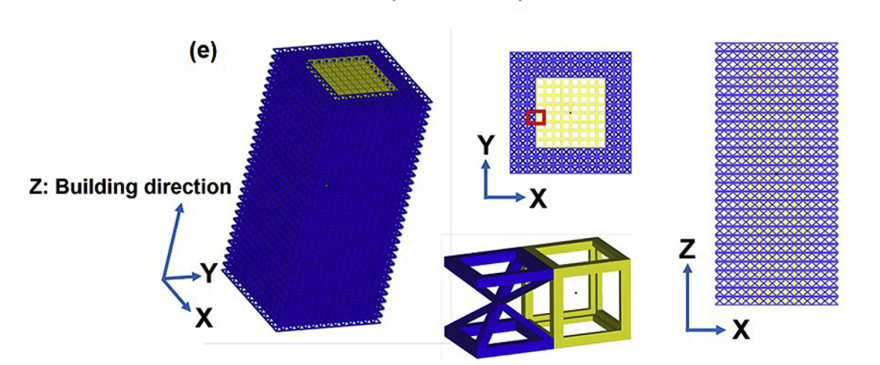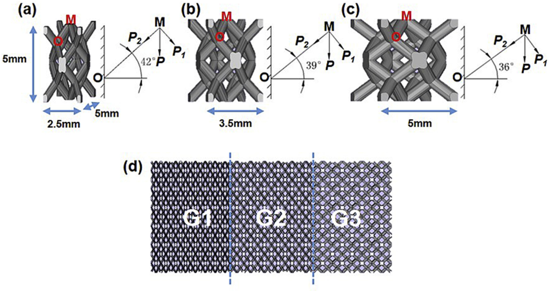 中科院的研究人员通过改变菱形十二面体单胞中的支柱倾斜角度与尺寸,设计了三种变形结构G1、G2、G3,分别研究了这三种结构的压缩性能,并且通过将这三种结构进行组合,设计了一种梯度结构,研究了其疲劳性能与疲劳损伤机制。