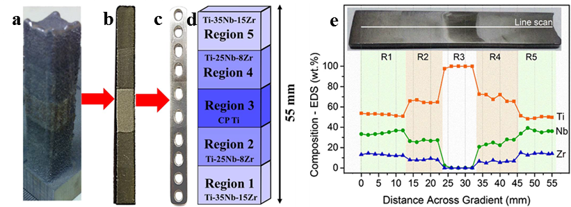 2017年5月10日,美国北德克萨斯大学材料科学与工程学系通过设计“刚度梯度结构”(组分分级)来解决所遮蔽效应,根据仿生学原理,在骨两端设计与骨模一致的低弹性模量的钛合金钢板(低模量的Ti-35Nb-15Zr(wt%)合金);而在骨折部位处设计弹性模量较高的钛合金钢板(高模量的医用纯钛);采用增材制造中的激光工程近净成形加工技术制造功能梯度生物医学植入物,即分段成形骨折内固定植入钢板,对成形结构进行扫描电子显微镜、X射线衍射、能谱分析检测,将成形后的骨折内固定植入钢板进行力学性能测试,检测各梯度材料结构处的弹性模量与硬度;最终达到使骨折内固定植入物与骨骼在各处弹性模量一致,消除应力遮蔽效应【2】。