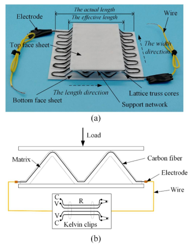 研究人员还做了LTSS的力学性能和基于电阻的自监测性能的实验,分析不同桁架倾角的性能差异。从打印角度、桁架支柱直径、桁架高度三个方面评估了打印精度,通过应力-应变曲线分析了LTSS的力学性能,通过如图2所示的试件,测试了电阻随应力的变化关系,结果显示电阻对应力的响应是一致的和可重复的,表明所制造的LTSS具有应力动态自监测能力。