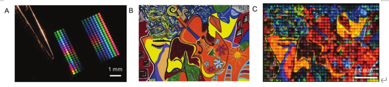 最后,为了实现“全光谱”结构色的目标,研究人员打印了一种结构调色板阵列,以研究其光学特性随放大周期的变化。通过系统地改变光栅周期,同时保持光栅高度恒定,能够生成跨越可见范围的完整调色板颜色像素,如图2A所示,每个正方形的尺寸为120μm×120μm。图2B为一幅彩色油画的图像,图2C为该油画的结构彩色打印,该打印说明,大规模全光谱结构彩色打印可以成功复制包含三种基本颜色的复杂混合颜色的大型绘画,且由于光聚合打印过程的性质,相邻色块之间的颜色过渡呈现黑色。