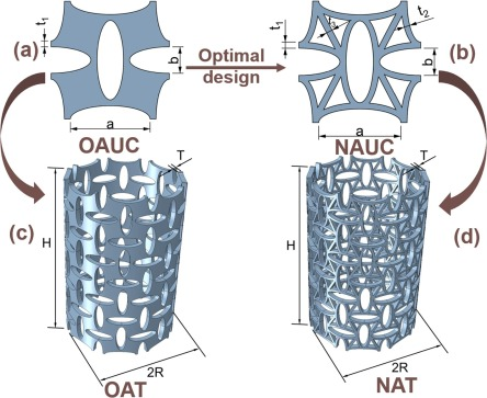 拉胀超材料具有许多理想的机械性能,例如抗压痕性、抗剪切性、抗断裂性和能量吸收能力。因此,拉胀超材料在医疗、航空航天、土木工程等领域具有广泛的应用前景。其中,管状拉胀超材料(NAT)由于其独特的几何设计和稳定的变形能力而被广泛应用于汽车防撞梁、血管支架等各个领域。然而,虽然已有关于拉胀超材料管的部分研究,包括二维和三维的金属材料,但拉胀穿孔超材料管与可重入蜂窝等结构相比存在更大的缺陷。由于其旋转刚性区域的质量较大,通常具有较低的比吸能。
