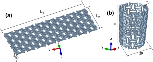 图4 轻量化超材料:(a)二维薄板拉胀超材料;(b)3D 管状拉胀超材料