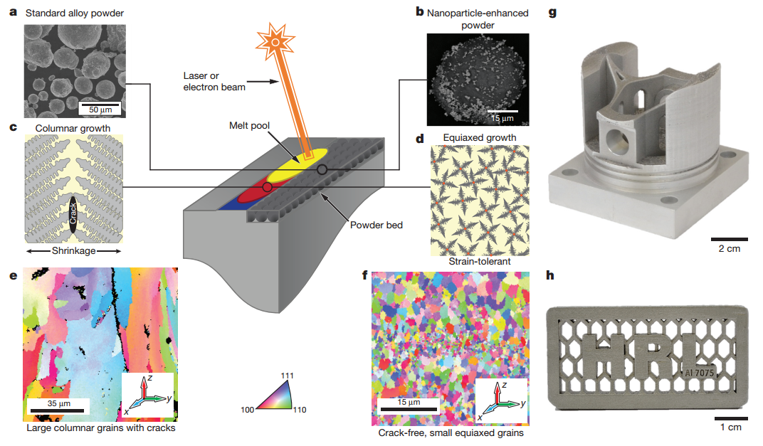 图1 高强度铝合金选区激光熔化示意图a,传统7075粉末;b,携带纳米细化剂的7075粉末;c,传统金属的柱状晶凝固过程(裂纹易产生);d,添加纳米细化剂金属的等轴晶凝固过程;e,传统金属的显微组织(反极图);f,添加纳米细化剂金属的显微组织;g,3D打印的拓扑优化6061活塞。h,3D打印的7075 HRL标志。